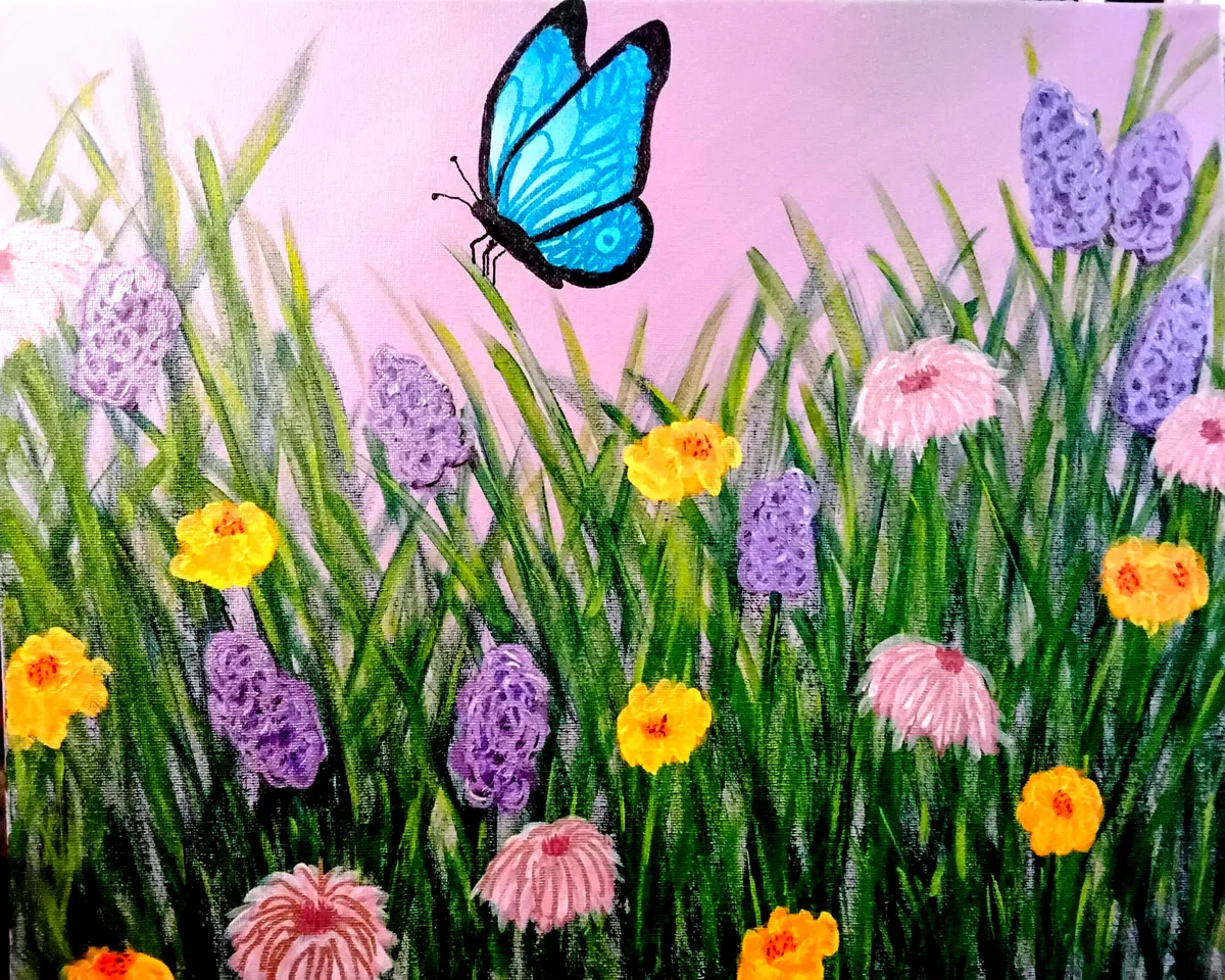Verdant Whispers and Indigo Wings captures a serene moment in nature where delicate flora and vibrant life coexist harmoniously. The composition features tall, lush grasses that gently sway, dotted with an array of colorful flowers—from deep purple clusters and bright yellow petals accented by warm orange centers to soft pink blossoms. A captivating blue butterfly with bold black-edged wings hovers delicately above the plants, introducing a sense of movement and vitality. Set against a subtle, light background, the artwork highlights the richness of the natural colors while evoking the quiet freshness of a garden at dawn. The piece invites viewers to pause and appreciate the quiet beauty found in everyday moments outdoors.